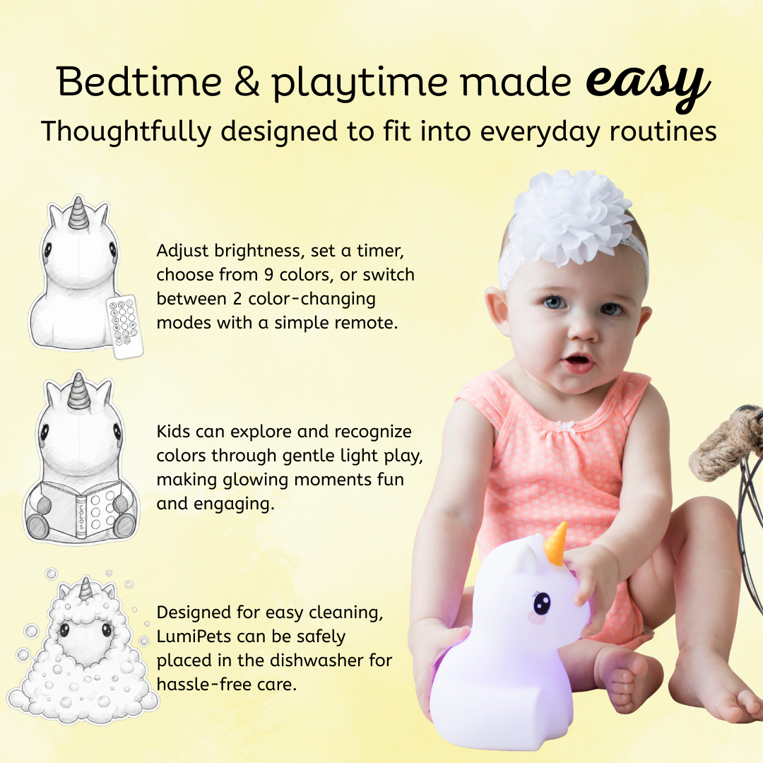 LumiPets® are the most technologically innovative, kid and parent loved childhood companion offered on the market today. With its changing lights and modes, LumiPets® offer all-day play, engaging color learning, and hours of endless fun!